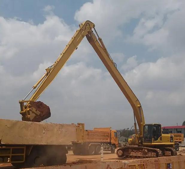 拥有加长臂挖掘机的挖掘机作业和行走场地应平整坚实,对松软地面应垫以枕木或垫板,沼泽地区应先作路基处理,或更换湿地专用履带板。使用前,履带式挖掘机的驱动轮应置于作业面的后方。挖斗容量按出厂标准配置使用,严禁更换使用大容量的挖斗。平整作业场地时,不得用铲斗进行横扫或用铲斗对地面进行夯实。